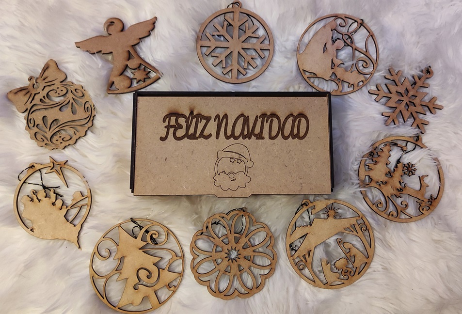 Te ofrecemos un pack de 10 bolas de temática exclusivamente navideña para que decores tu árbol de una forma original. Entre los diseños puedes encontrar bolas grabadas y cortadas con  diferentes detalles navideños: copo de nieve, Belén, mini árbol navideño, angelito, reno, etc.