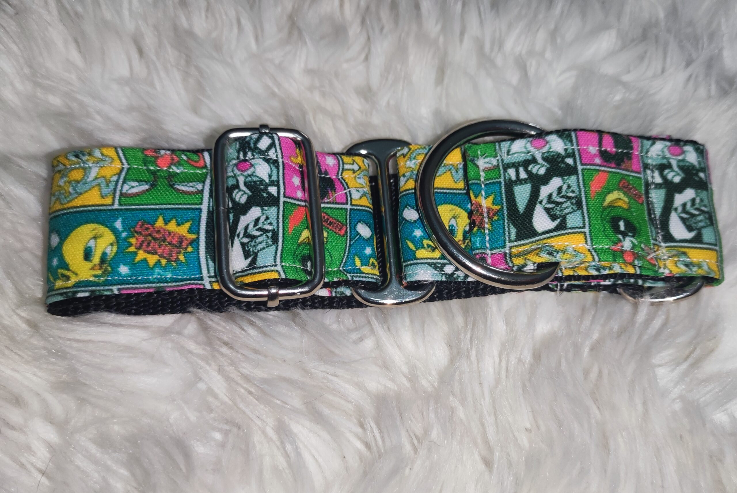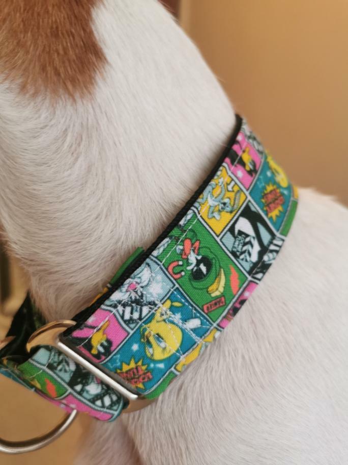 Puedes elegir entre nuestras diferentes telas, cada una de ellas son de edición limitada, como nuestras tela de Looney tunes, por lo que solo habrá un número limitado de collares con cada tela, no te quedes sin el tuyo.