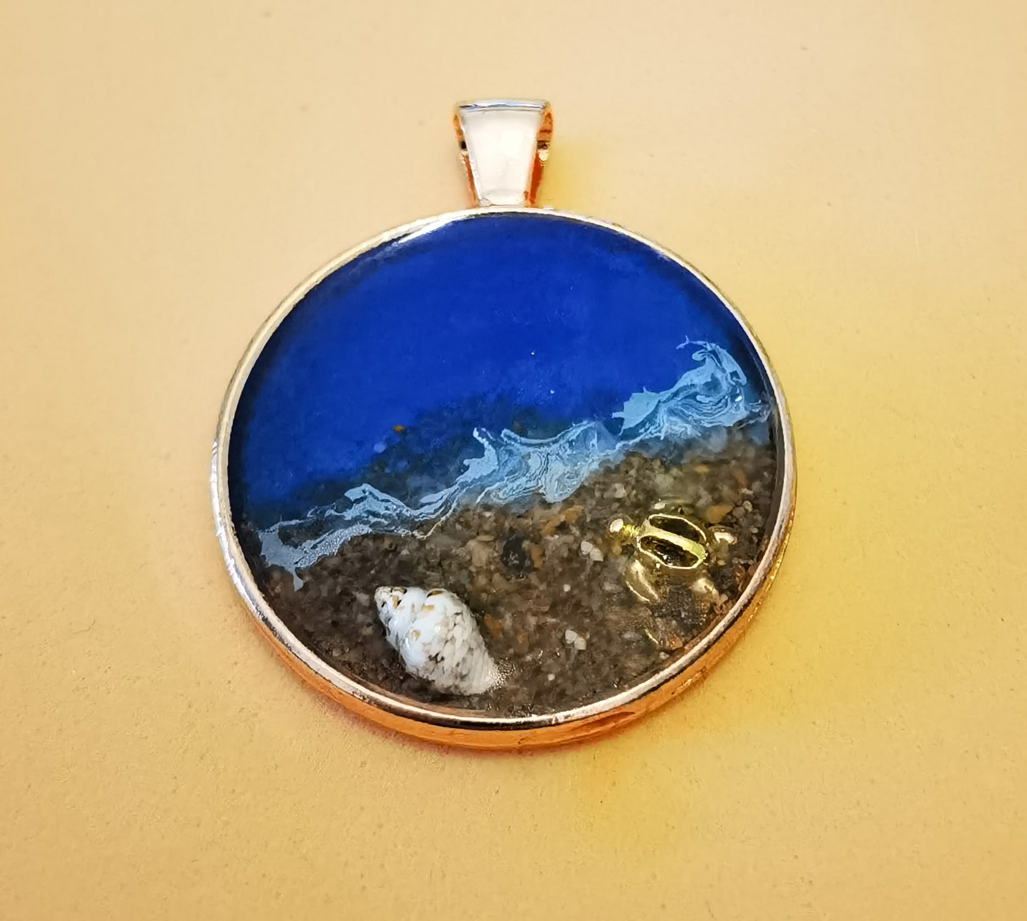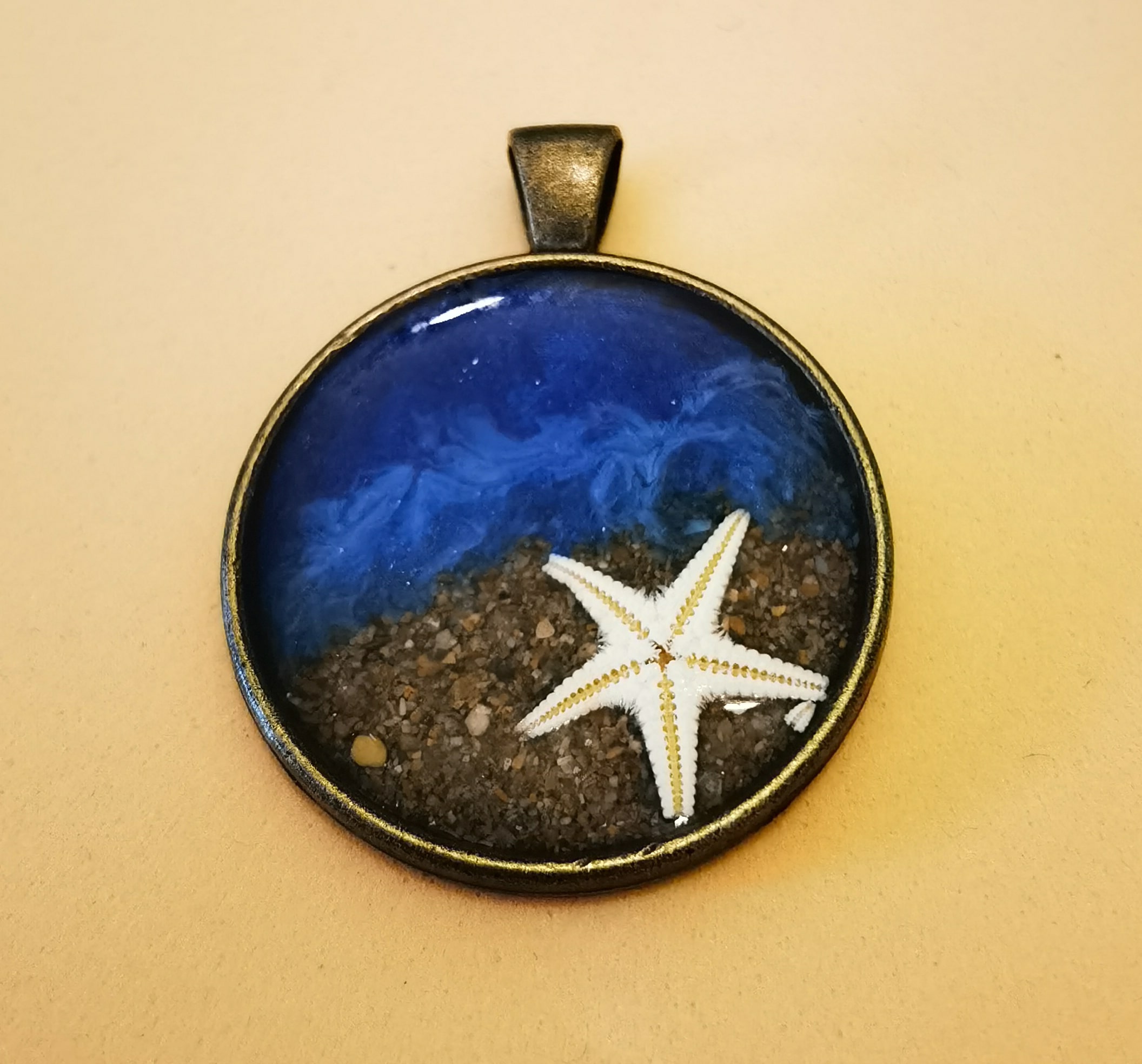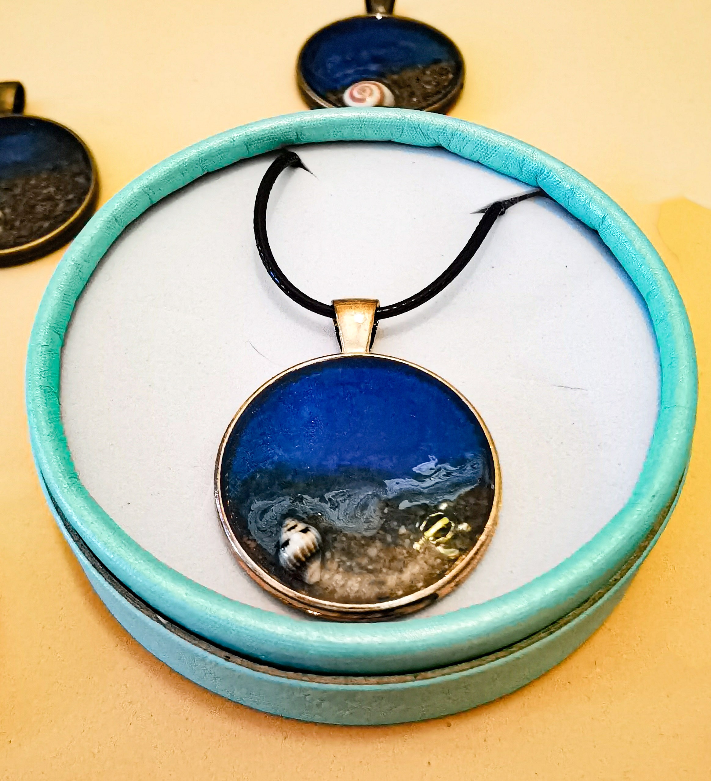 Materiales: resina epoxi, latón, cordón negro, detalles marinos.