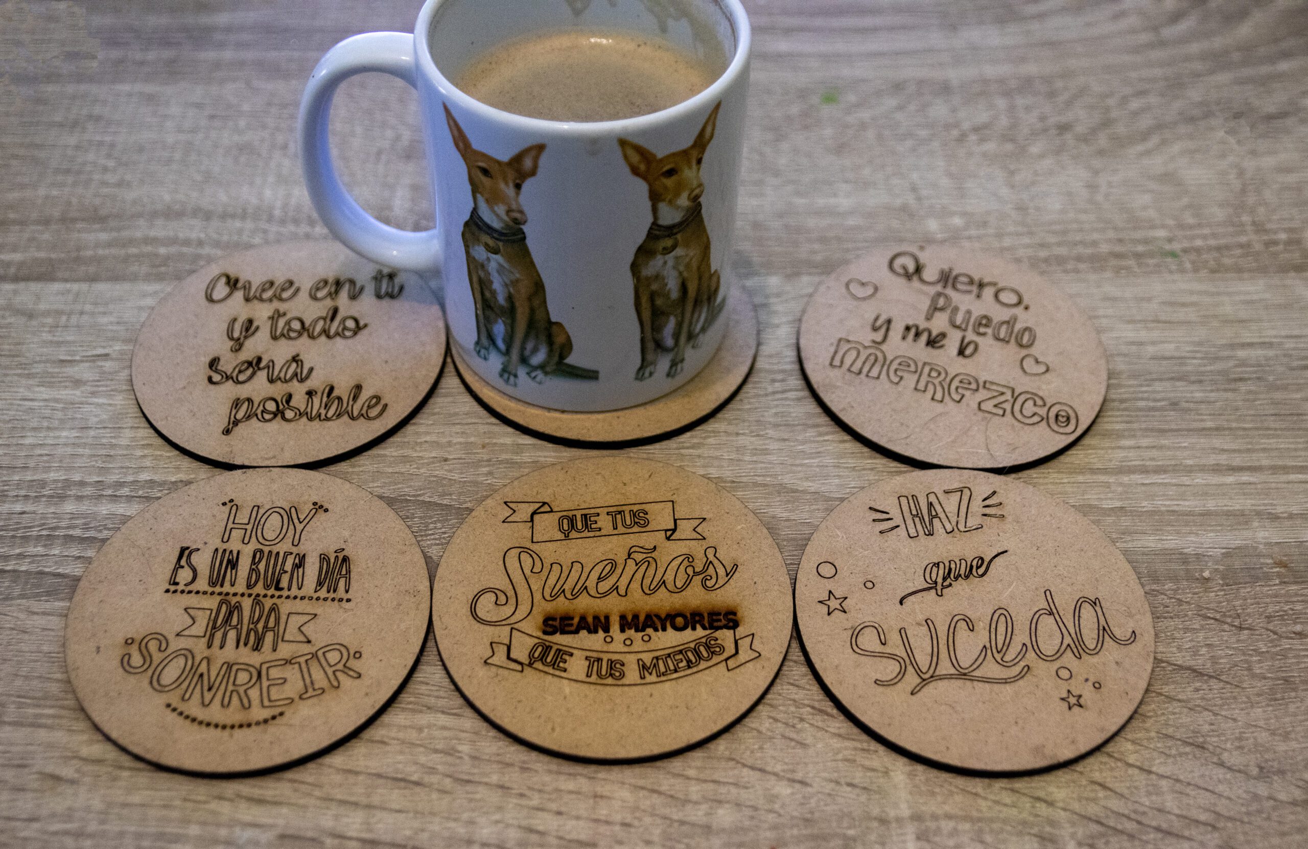 Agrega una dosis de inspiración a tu mesa con nuestros posavasos redondos con frases motivadoras.